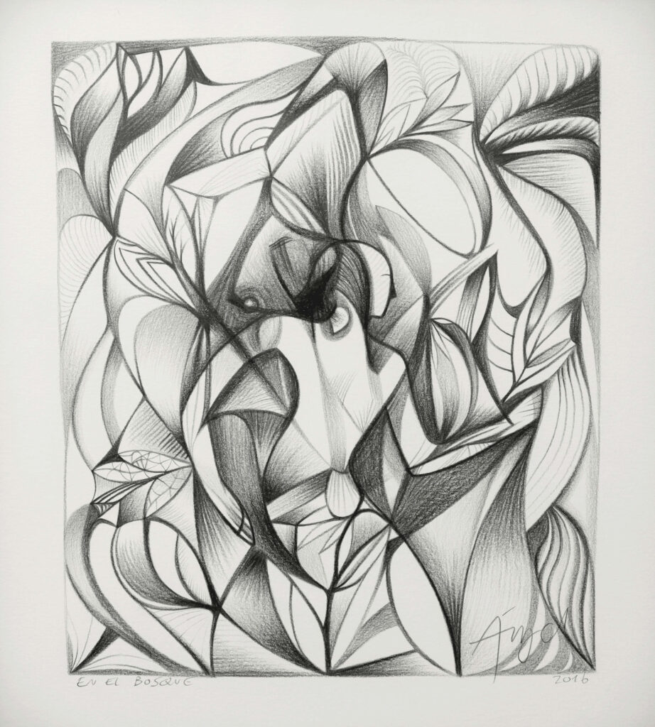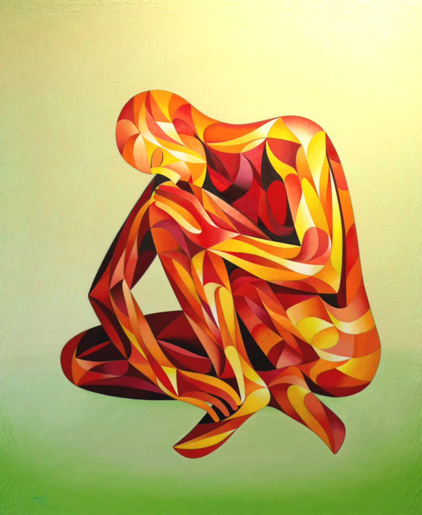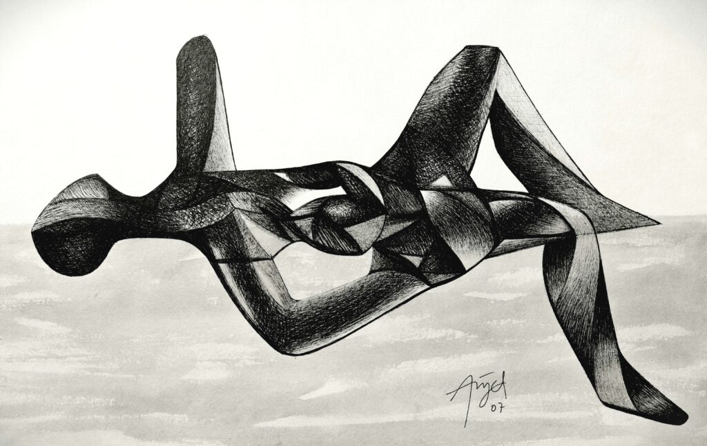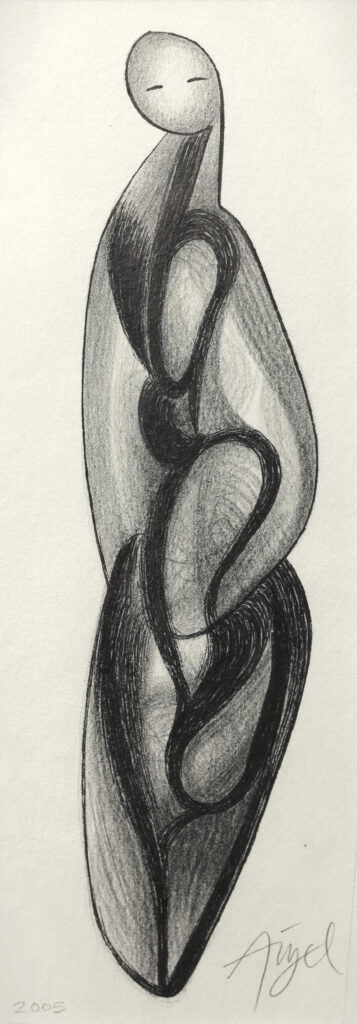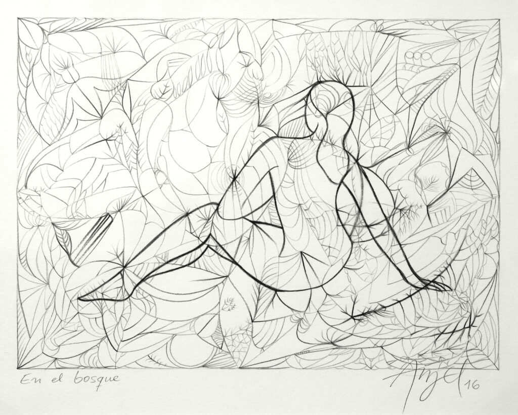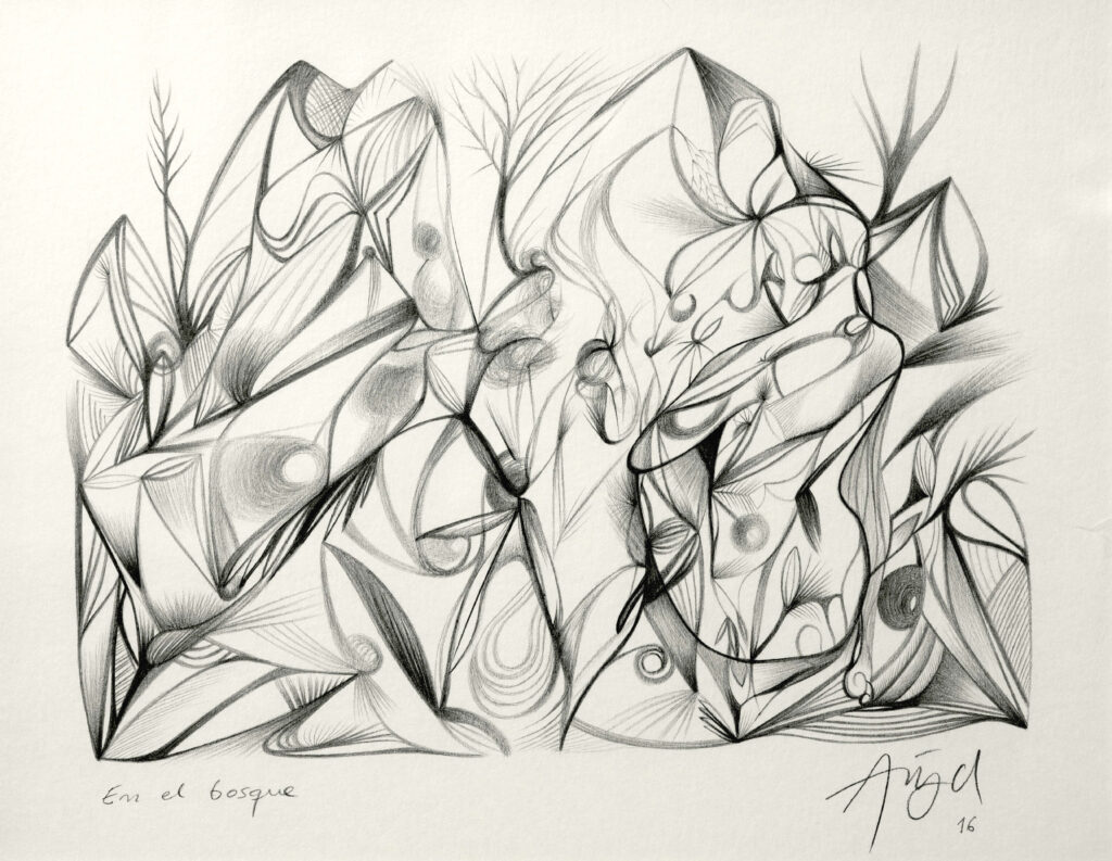 Ángel Estévez en esta muestra nos propone reflexionar acerca de las relaciones entre naturaleza y ser humano. Los títulos de sus obras son evocadores de un remanso al que podemos llegar a través de la simbiosis con el mundo natural: Manantial, Reposo, Sueño, Mujer hoja…poesías dibujadas, estados de ánimo equilibrados, colores hermanados en forma y semántica. Emociones desplegadas, pero también contenidas, todo ello en un corpus jugoso, prolífico y certero.